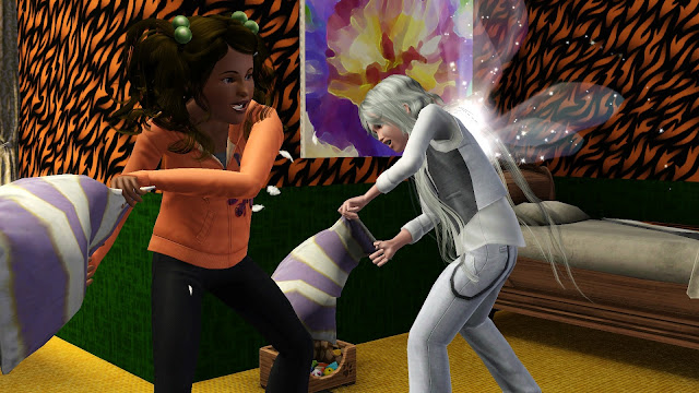 Han såg förvirrad ut men tog emot kudden och stirrade på den. Han borde istället ha haft ögonen på Ester för hon träffade honom snart med en annan kudde.