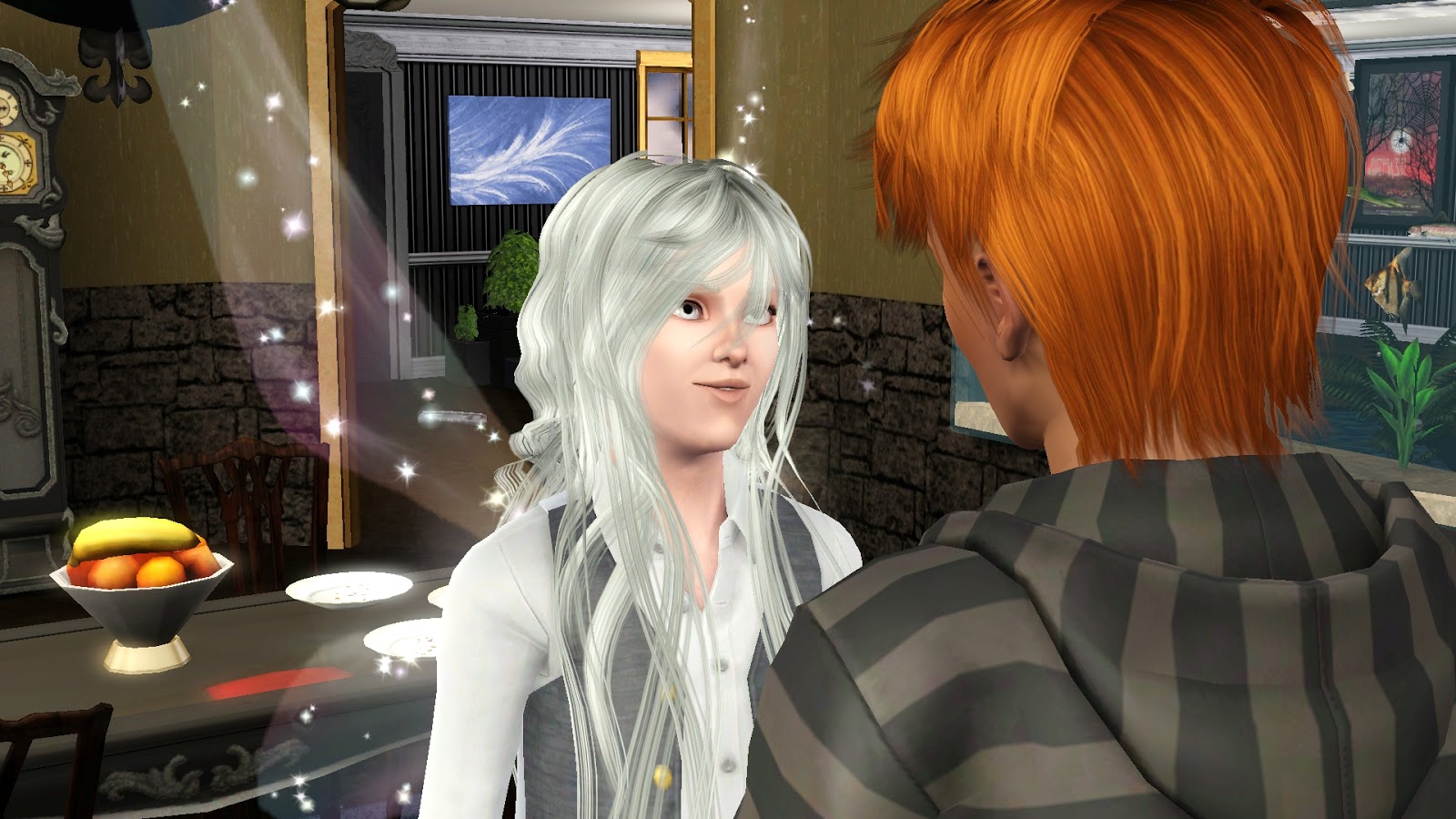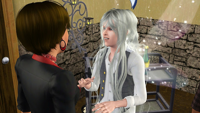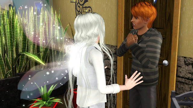 När hon kom hem med maten så märkte hon dock att Ester glömt att säga något om sin vän. Han såg minst sagt annorlunda ut, men att han var blek som ett spöke med kritvitt hår och lika vita ögon gjorde henne inget, det var hans skimrande vingar som fick henne att bli osäker på vad det var för vän Ester hade hittat. Han uppförde sig dock som om både han själv och familjen vore kungligheter så hon såg inget fel med att ha honom där egentligen. Men när dom väl börjat äta så kunde hon inte hålla sig längre.